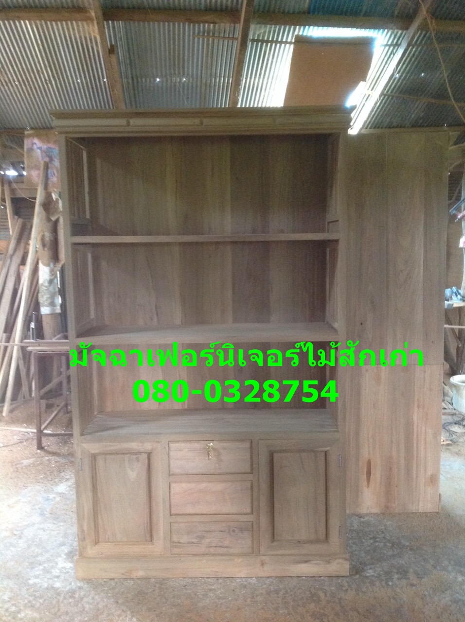 เฟอร์นิเจอร์ตู้หนังสือทำจากไม้สักเก่านำมาแปรรูปด้านข้างแบบชี้( ขาทึบ) มั3ช่อง 3ลิ้นชัก 2บานเปิดช้าย,ขวา